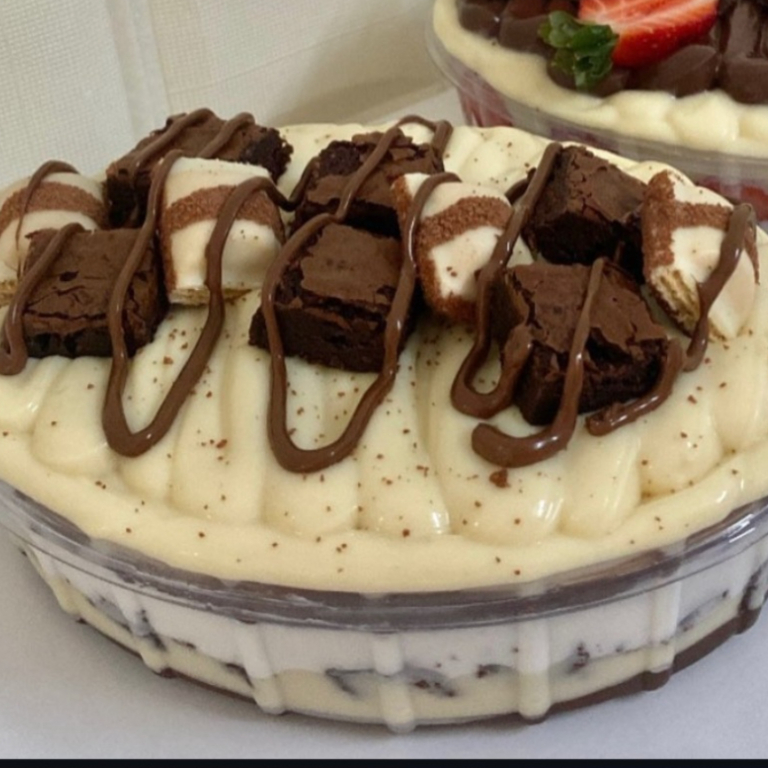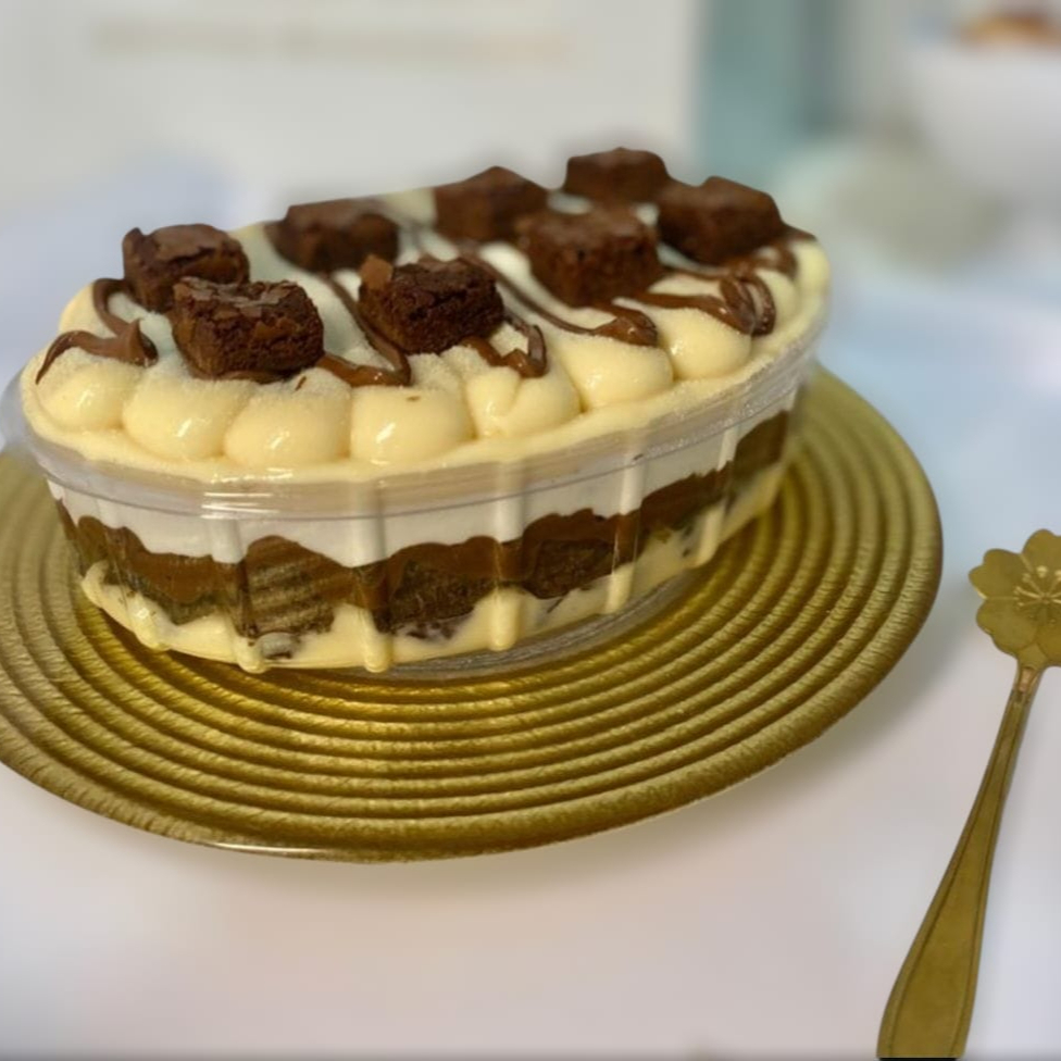 Deliciosa Sobremesa na Travessa,preparada com brigadeiros cremosos de Leite Ninho,Brigadeiro de Cacau 50%,mousse de Ninho,brownie chocolatudo,pedacos de bombom dentro da sobremesa. finalizado com bombom Ouro Branco.travessa pequena,serve em média 4 porções