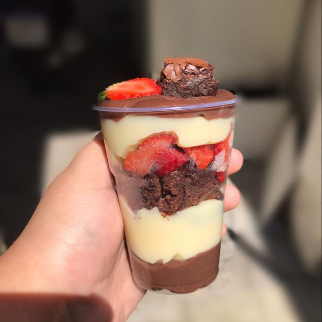 Deliciosa combinação entre brigadeiro cremoso de Cacau 50%,creme 4 leites com chocolate branco, pedacos de brownie e morango fresco! (nossos copos são bem recheados)