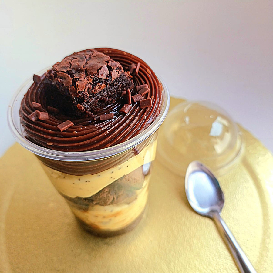 Deliciosa combinação entre brigadeiro de Cacau 50% com chocolate,brigadeiro de maracujá,preparado com a própria fruta, intercalado com camadas de brownie. Para finalizar essa perfeita combinação,granulados de chocolate puro,aquele que derrete na boca e mais brownie! (nossos copos são bem recheados)