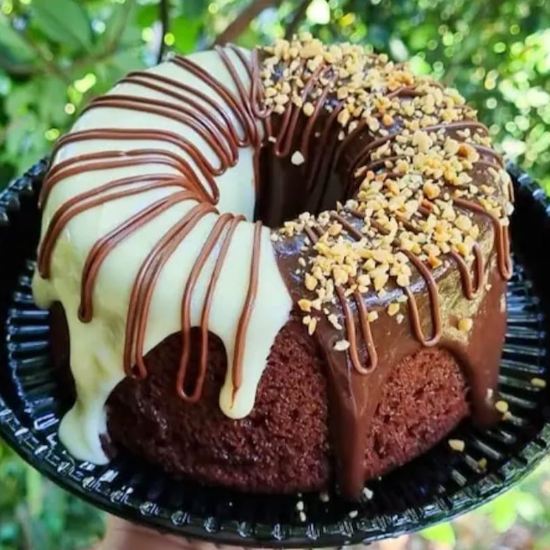 Delioso bolo caseiro com massa fofinha de Cacau 50% com cobertura de brigadeiro de Leite Ninho e Brigadeiro de Cacau,finalizado com fios de Nutella e do outro lado fios de nutella e amendoim. Perfeito para saborear com um cafezinho ou uma Coca geladinha ; ) *serve média 6 porçoes *forma 16cm