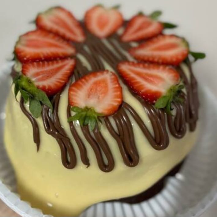 Delioso bolo caseiro com massa fofinha de Cacau 50% com cobertura de brigadeiro de Leite Ninho ,finalizado com granulados de chocolate nobre e morangos. Perfeito para saborear com um cafezinho ou uma Coca geladinha ; ) *serve média 6 porçoes *forma 16cm