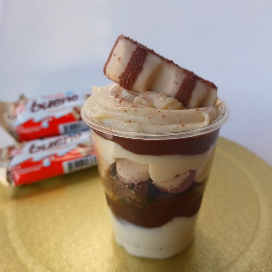 Deliciosa combinação entre Brigadeiros Cremosos,Mousse de Leite Ninho,Brownie chocolatudo com casquinha crocante,bombom Kinder Bueno White dentro do copo, Finalizado com mais bombom Kinder na sua decoração.