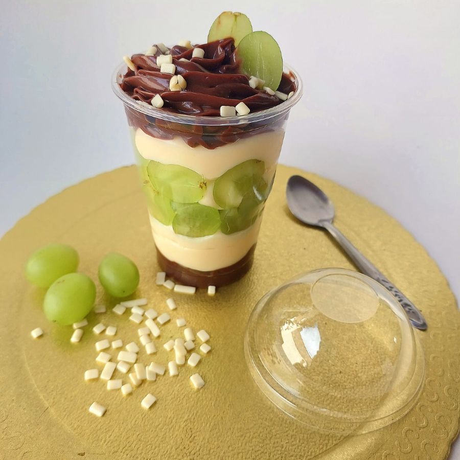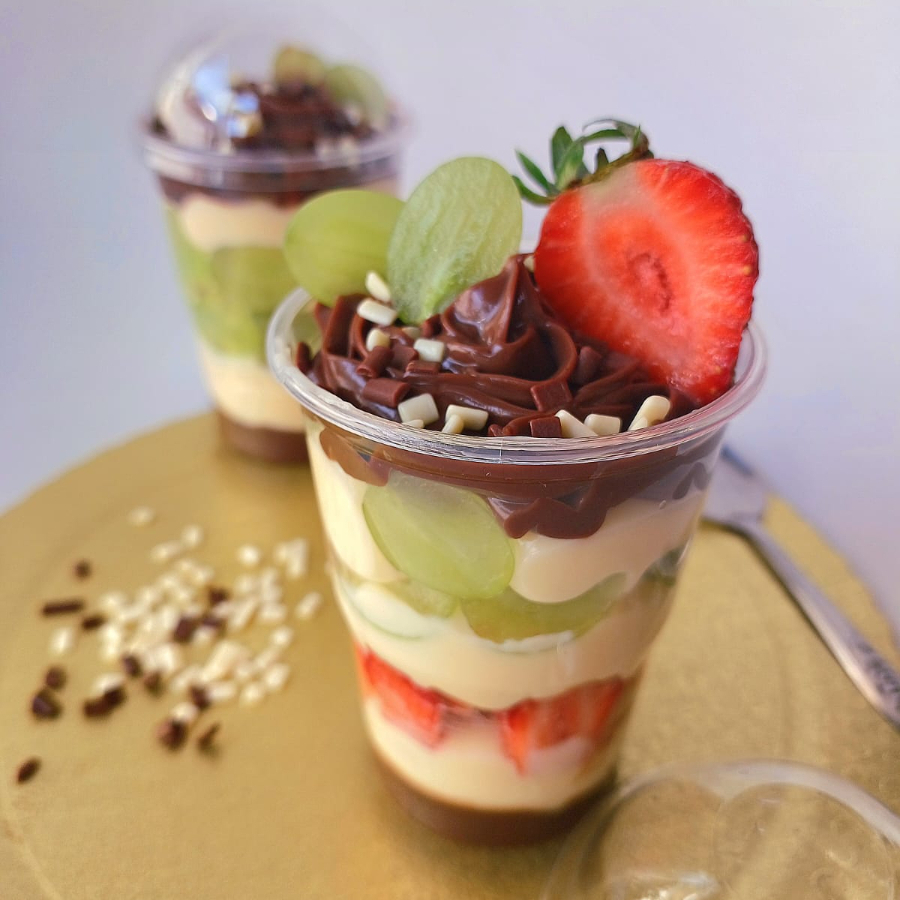 Deliciosa combinação entre brigadeiro de Cacau 50% com chocolate,Creme 4 leites com chocolate branco,intercalado com morango e uva verde,sem sementes (thompson) Para finalizar essa perfeita combinação,granulados de chocolate puro,aquele que derrete na boca! (Nossos copos são bem recheados)
