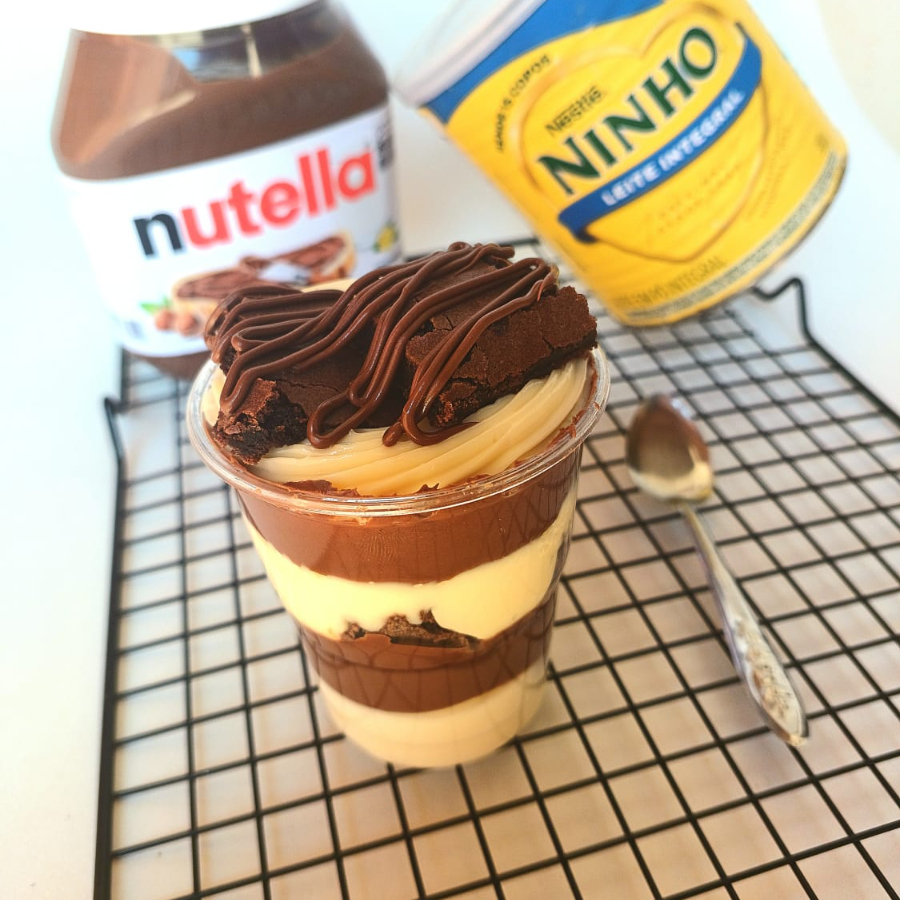 Deliciosa combinação entre brigadeiros cremosos de Cacau 50% com chocolate,Creme 4 leites com chocolate branco, mousse de Leite Ninho,intercalado com camada de brownie e Nutella purinhaa! E mais Nutella na decoração ; ) (nossos copos são bem recheados)