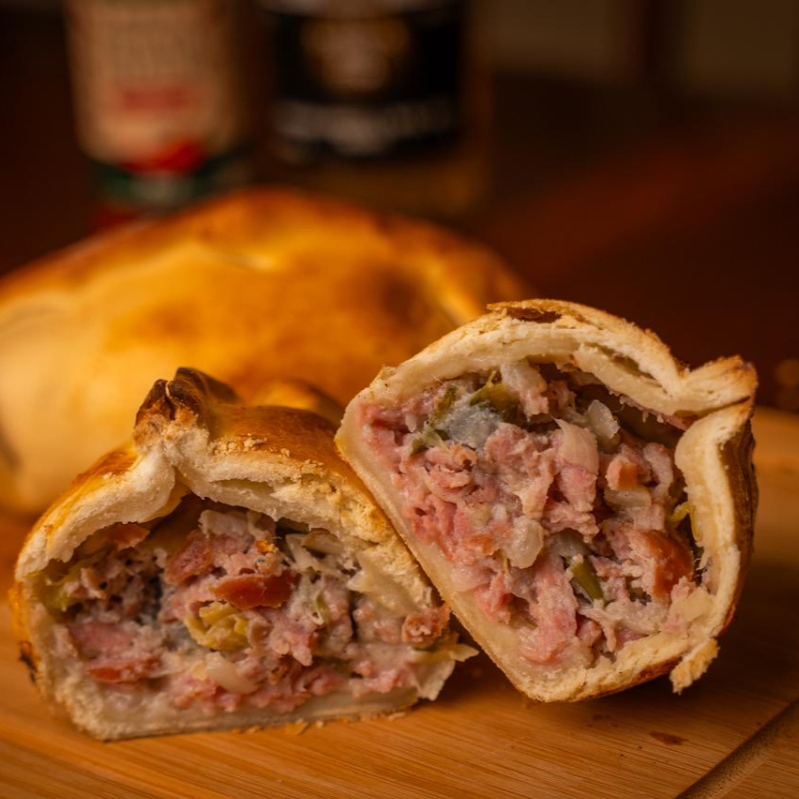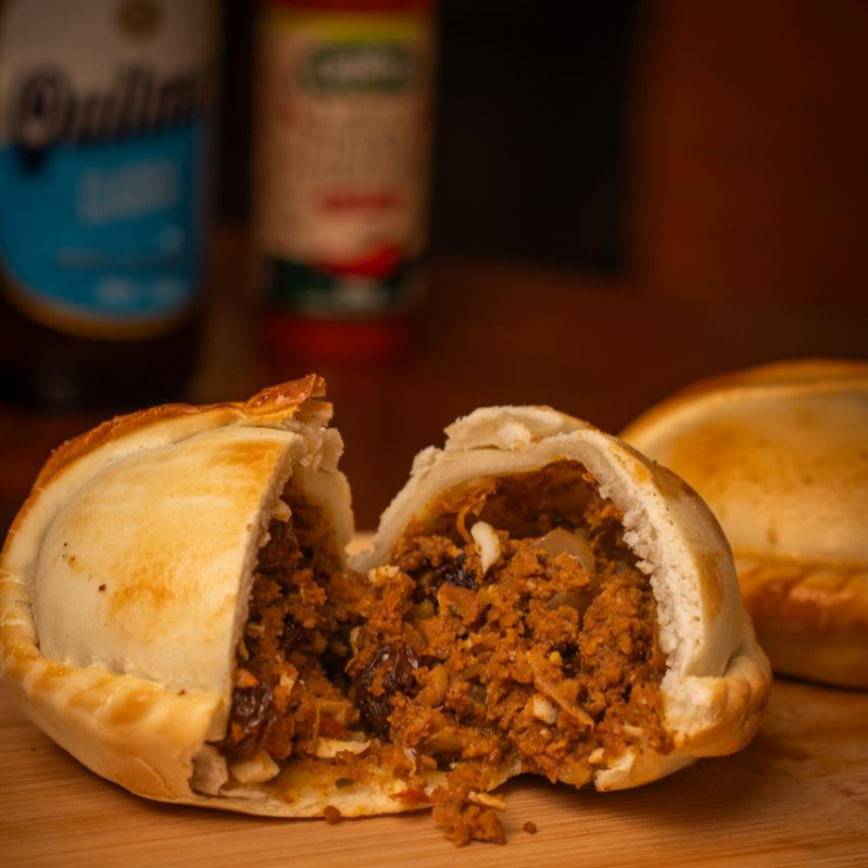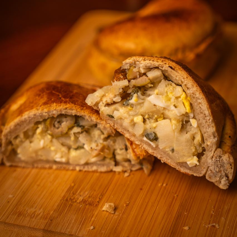 Carne, uva passa, cebola, pimentão vermelho, ovos e azeitonas.