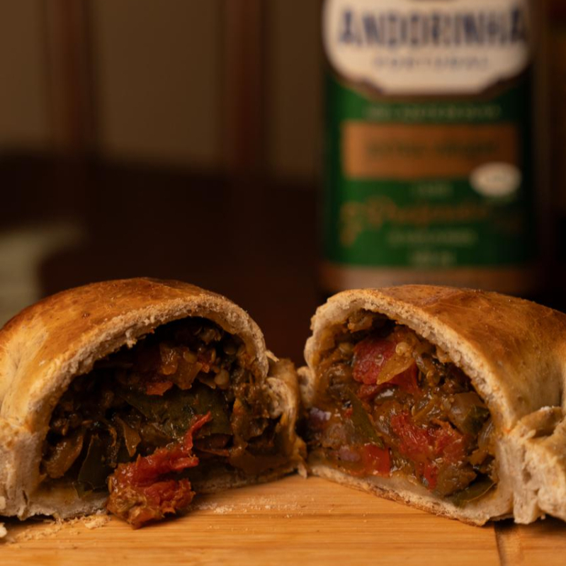 Berinjela, tomate seco, azeitona preta e pimentão vermelho.