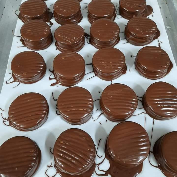 Alfajor tradicional artesanal argentino, chocolate e doce de leite.