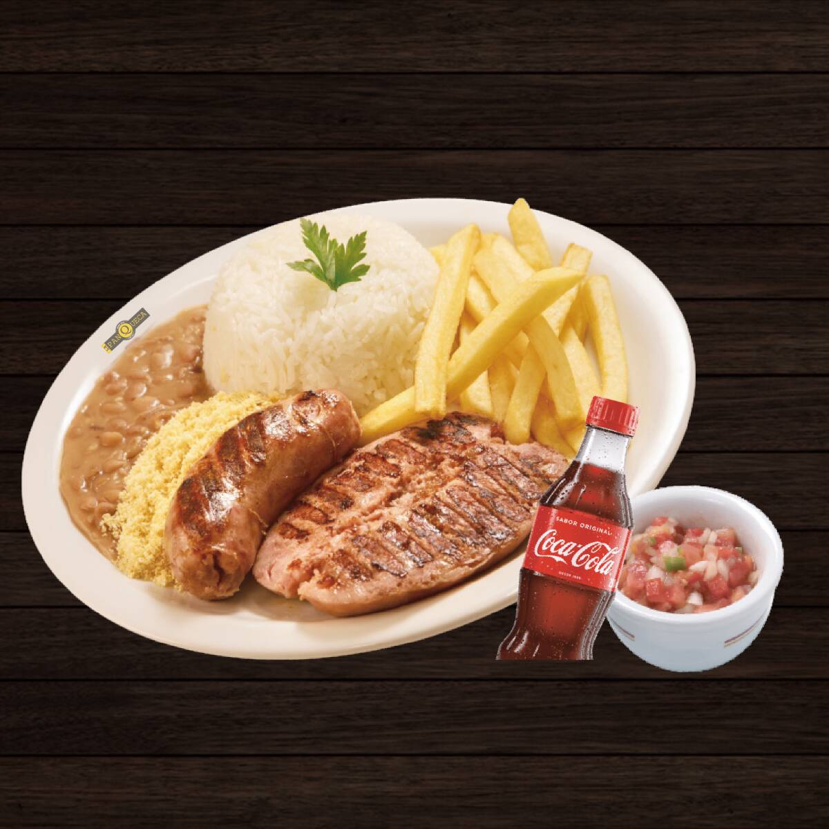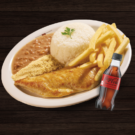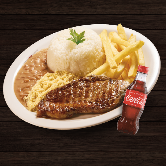 Arroz, feijão, fritas e farofa. Acompanha uma coca-cola 200ml
