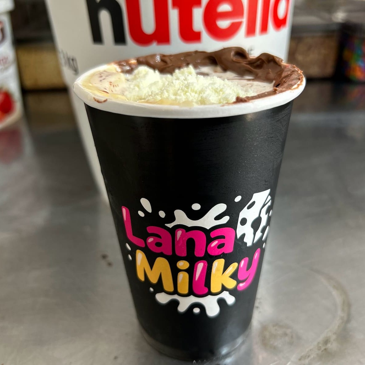 Sorvete cremoso batido com creme de coco, nutella na borda e coco ralado para finalizar