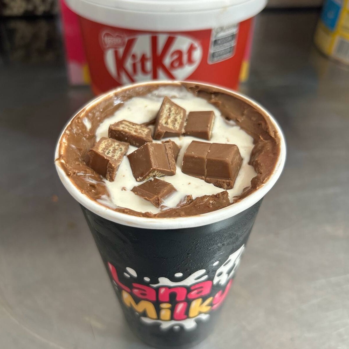 Sorvete cremoso batido com creme de Kitkat, creme e pedaços de Kitkat na borda.