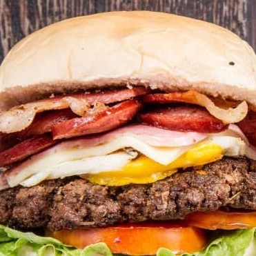 Pão, Hambúrguer 90g, Bacon, Mussarela, Presunto, Alface, Tomate, Maionese, katchup, Mostarda e molho Barbecue.