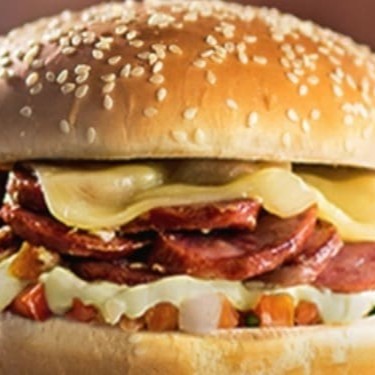 Pão, hambúrguer 56g, calabresa, queijo, presunto, alface, tomate, maionese e ketchup.