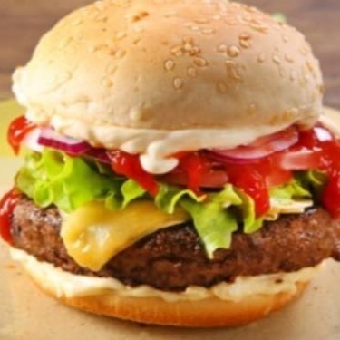 Pão, hambúrguer 120g, queijo, maionese e ketchup