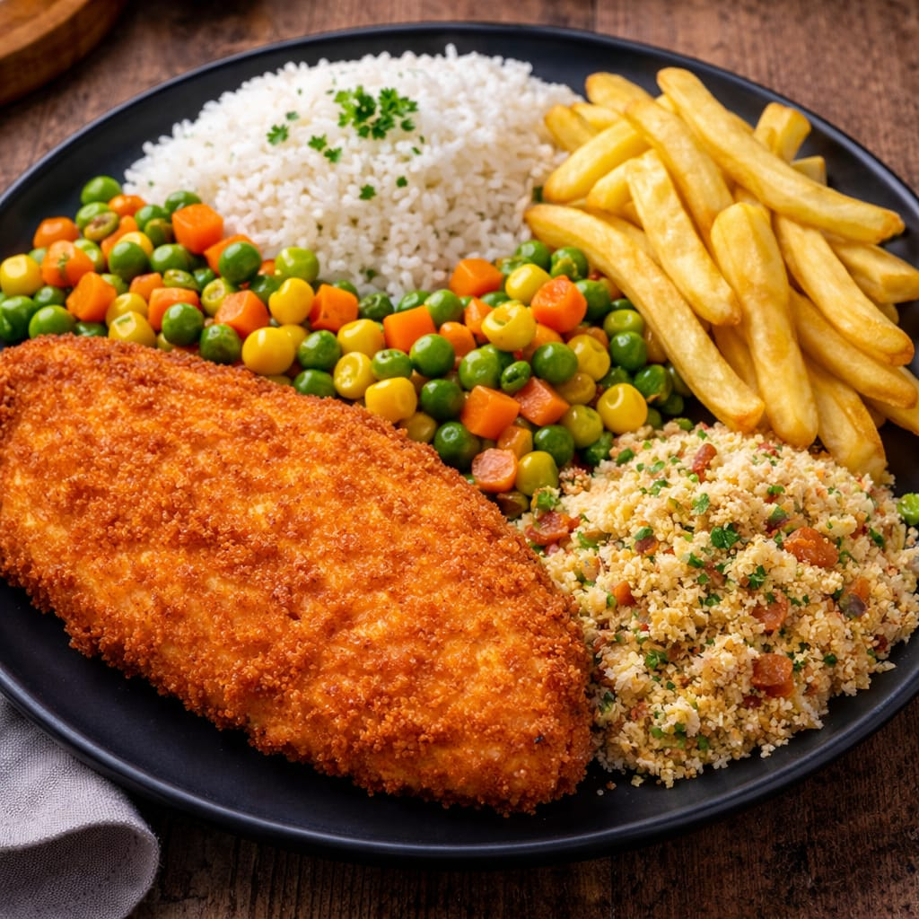 Acompanha arroz branco, legumes na manteiga, farofa e fritas