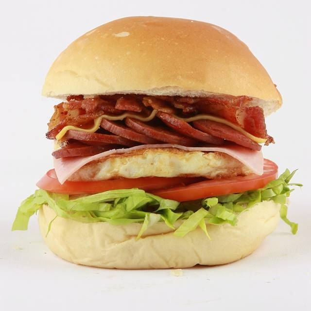 Pão, hambúrguer, queijo, presunto, ovo, bacon e salada.