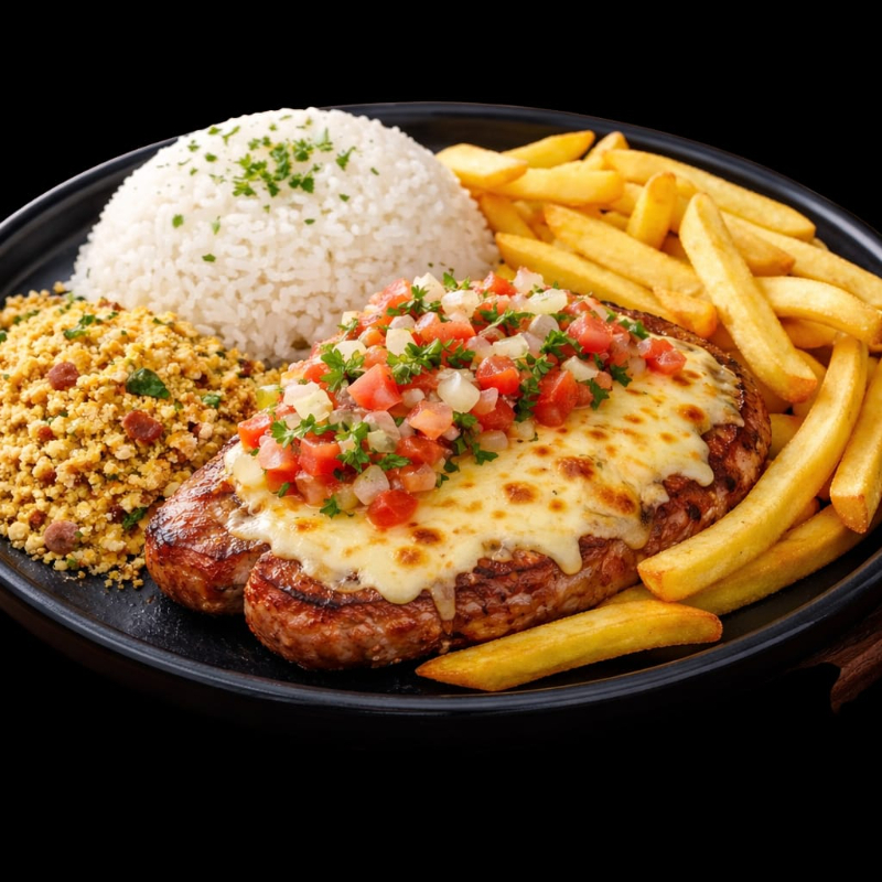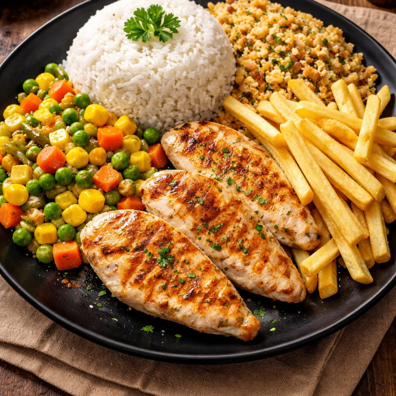 Acompanha arroz branco, legumes na manteiga, farofa e fritas.