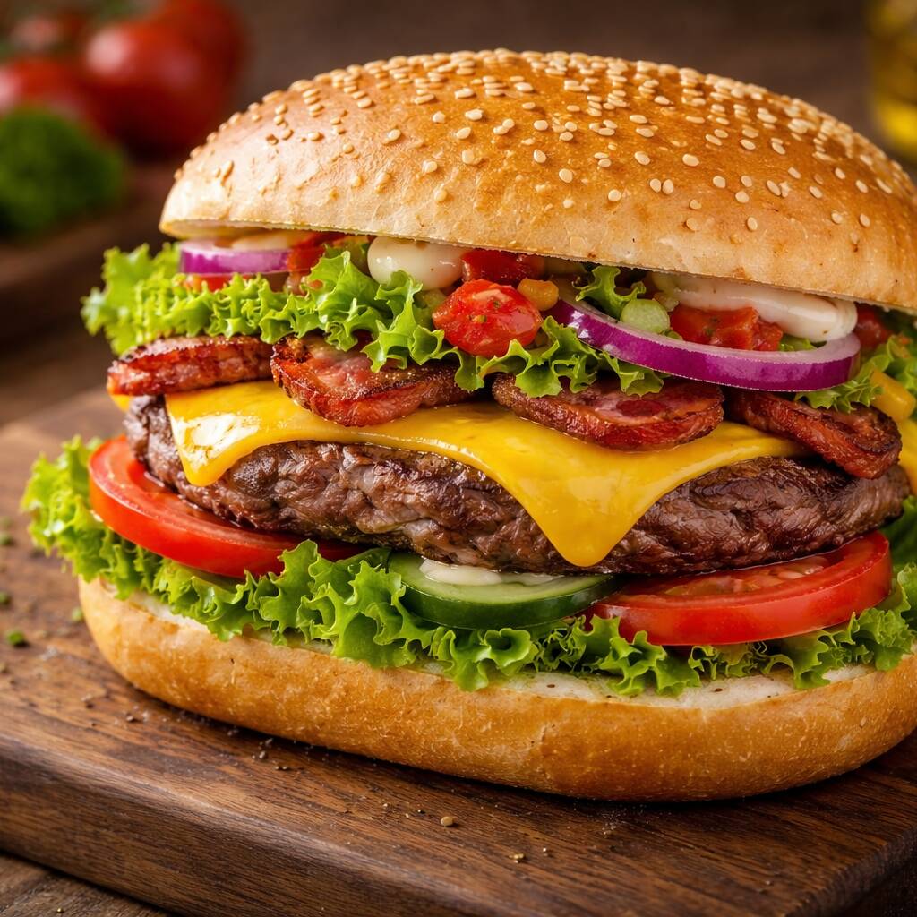 Pão ,hambúrguer, queijo, bacon e salada