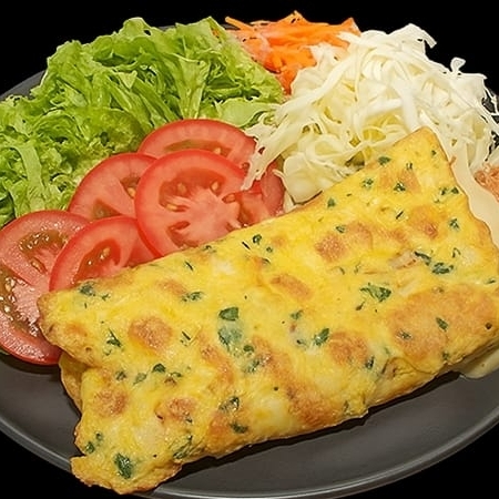 Três ovos, cheiro Verde, atum, mussarela e cubos de cebola- acompanha alface, tomate, cenoura, repolho e palha