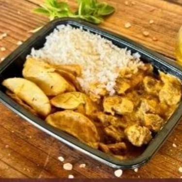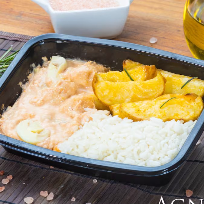 Tradicional Strogonoff De Frango Com Arroz Branco E Batatas Rusticas Uma Verdadeira Delicia.