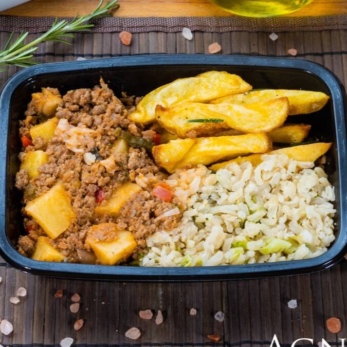 Patinho Moido Com Aipim, Batatas Rusticas, Arroz Integral Com Brocolis.