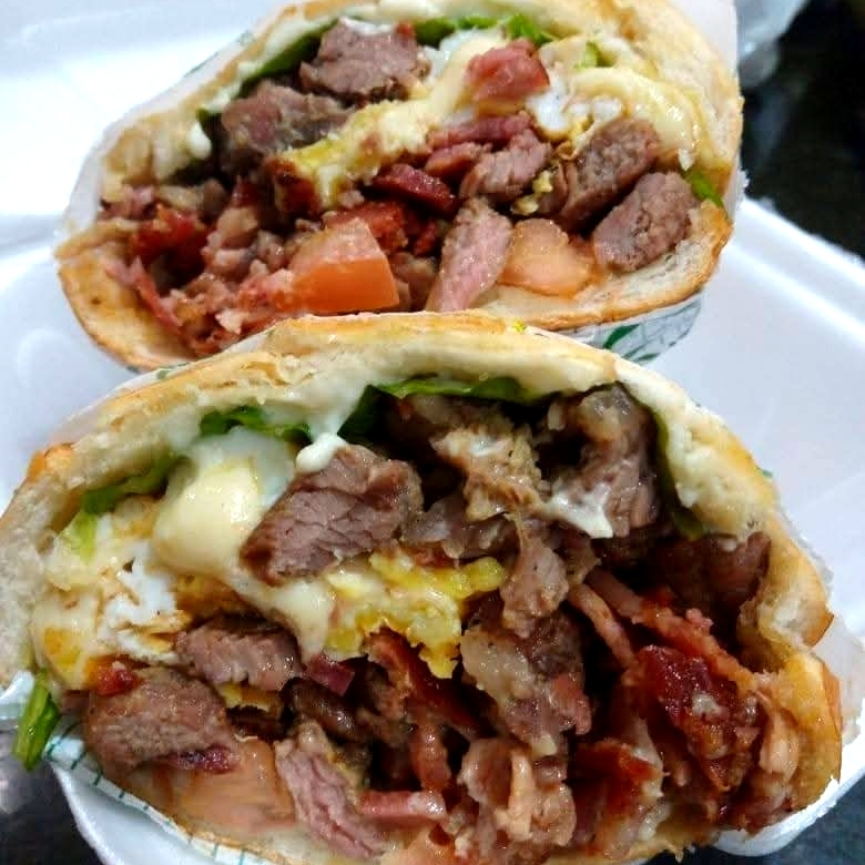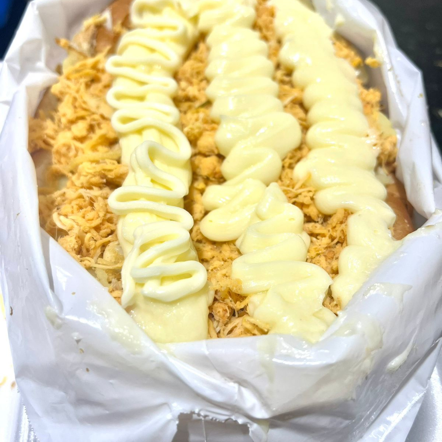 frango, catupiry original, salsicha, calabresa, ovo, presunto, mussarela, alface, tomate, milho, batata palha e molhos