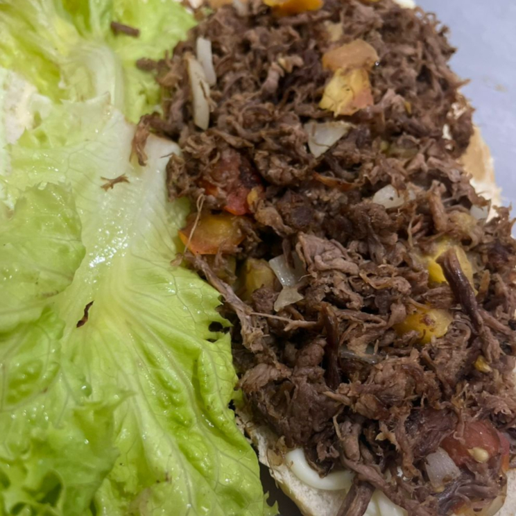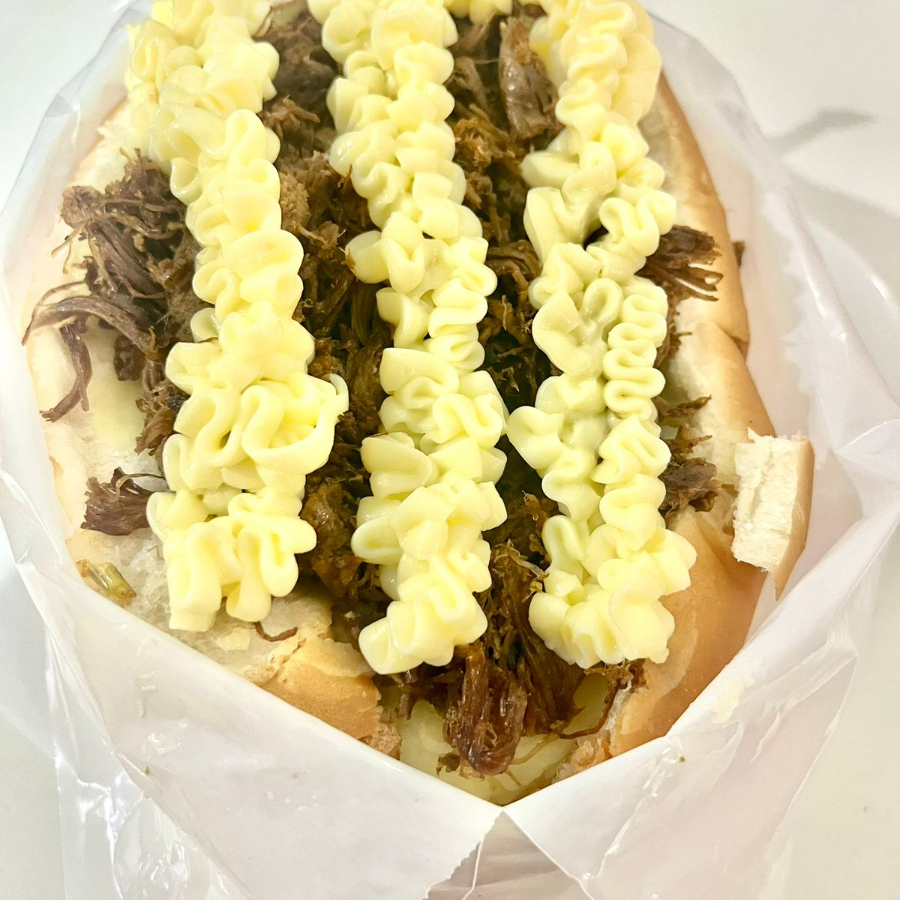 costela desfiada, ovo, 3 fatias provolone, catupiry original, rucula, vinagrete, maionese temperada e tradicional.