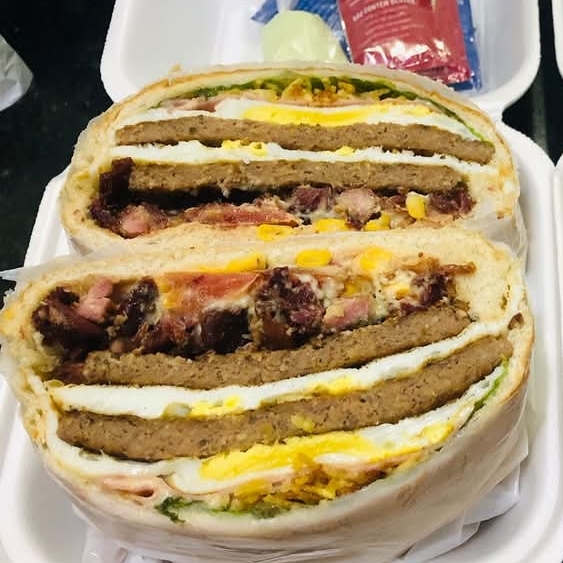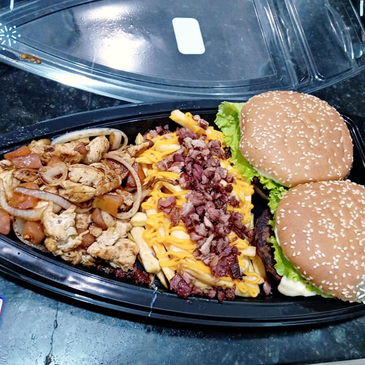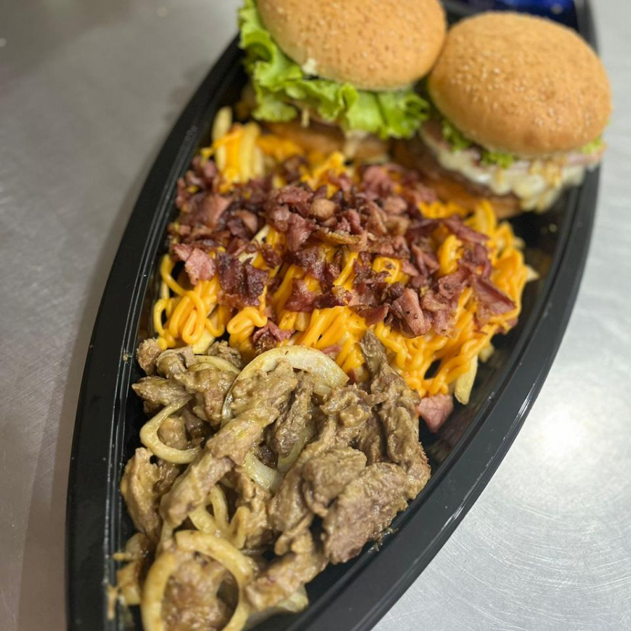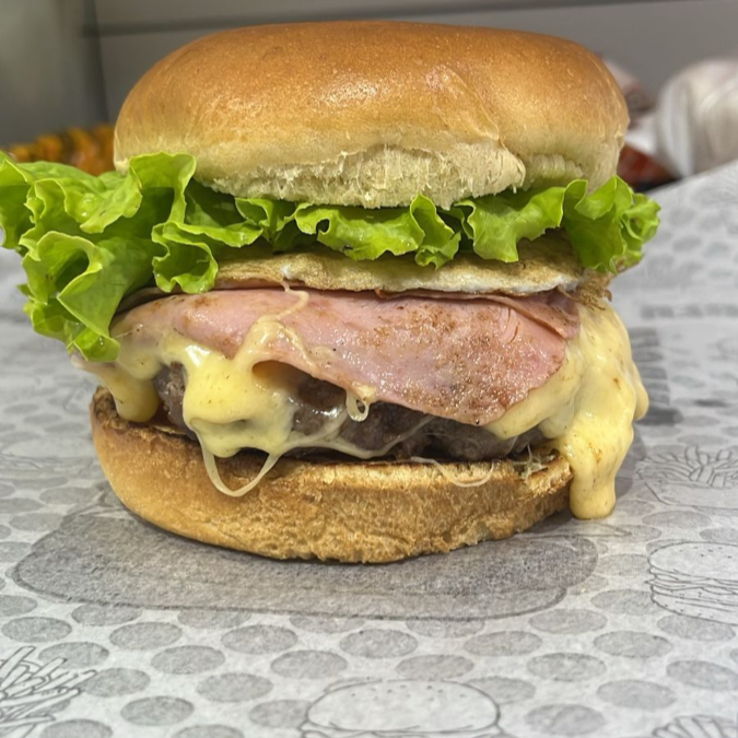 2 hamburgueres, bacon, frango, catupiry original, calabresa, 2 salsichas, 2 ovos, presunto, mussarela, alface, tomate, milho, batata palha e molhos