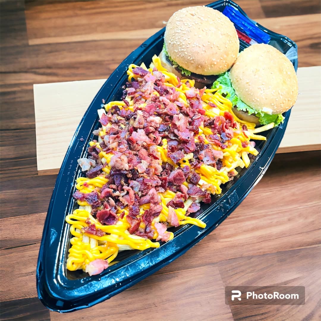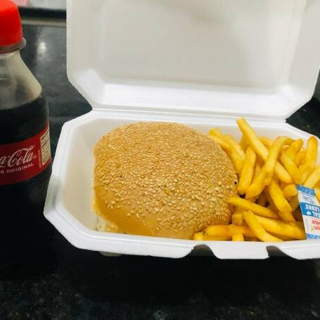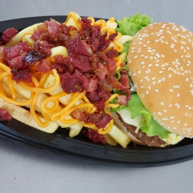 (Pao, hamb, queijo cheddar, 2 fatias baco ) + fritas 200 gr + 1 caçulinha