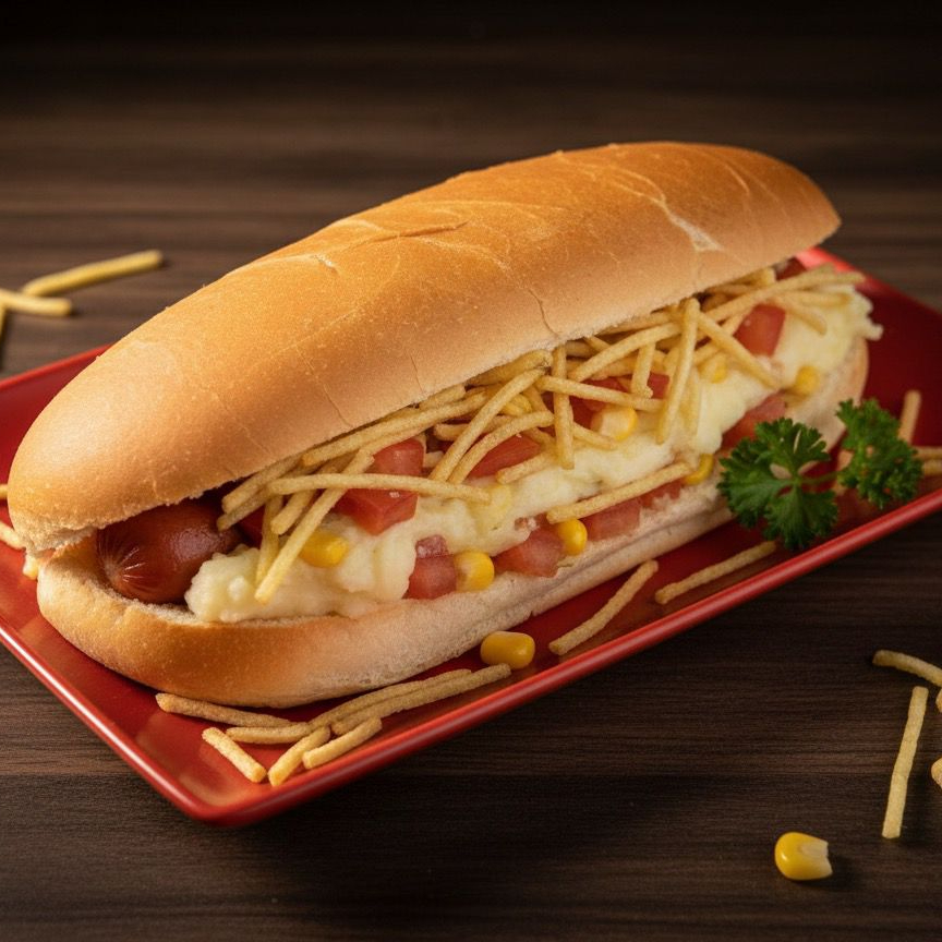 hot dog prensado: salsicha, tomate, milho, batata palha, pure de batata e molhos