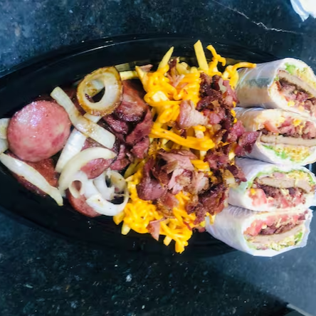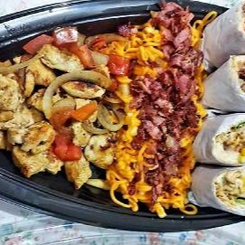 1 porção fritas com cheddar e bacon + 1 porção calabresa acebolada + 1 porção frango acebolado com tomate + 1 porção contra filé acebolado + 2 cervejas ou 1 kuat 2 litros (colocar na observação)