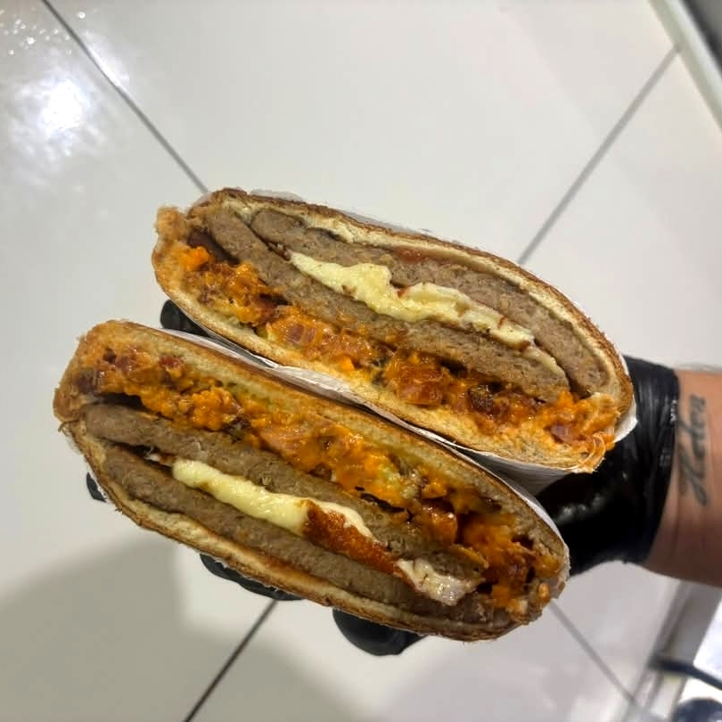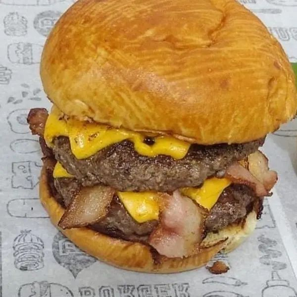 2 hamburgueres, bacon, cheddar, 2 fatias mussarela e molhos