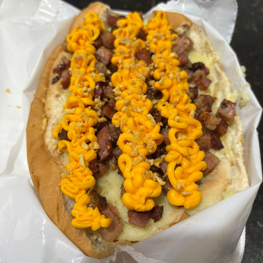 hot dog prensado: 2 salsichas, bacon, frango, catupiry original, tomate, milho, batata palha, pure de batata e molhos