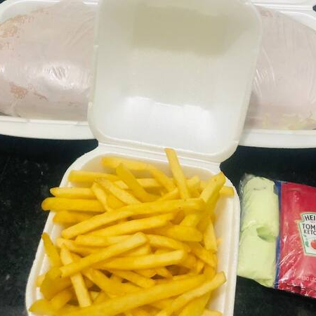 (Pao, hamb, catchup, presunto, queijo, alface e bat palha ) + fritas 200 gr + 1 caçulinha