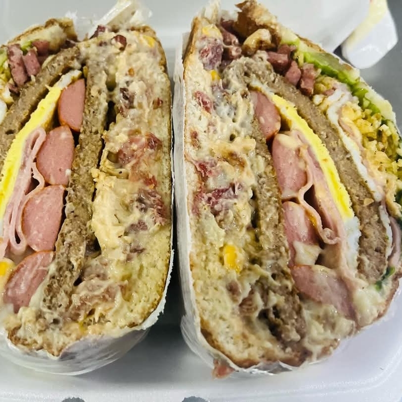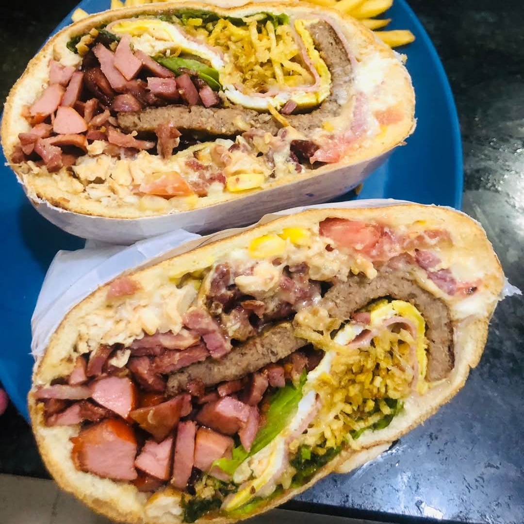 hamburguer, bacon, calabresa, presunto, mussarela, alface, tomate, milho, batata palha e molhos