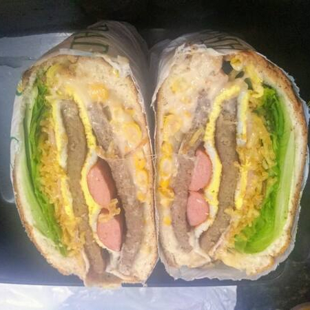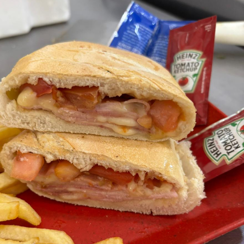 2 presuntos, 2 mussarelas, ovo, alface, tomate e molhos