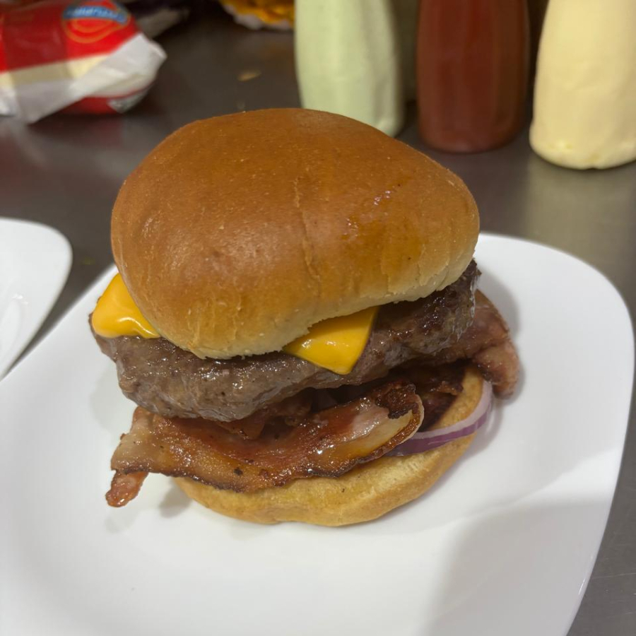 pão brioche, hamb costela 200 gr(in natura) maionese de azeitona, cebola roxa, fatias de bacon, 02 fatias queijo cheddar