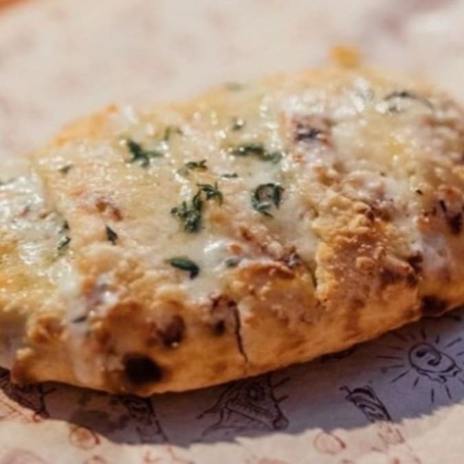 Recheado com creme de alho caseiro, requeijão de corte, requeijão cremoso, tomilho e alho frito