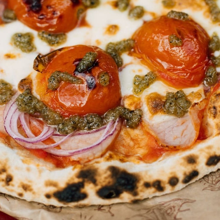 Molho Lastro de tomate, alho laminado, lombo defumado, cebola roxa, tomate assado da casa, requeijão de corte, fior di latte, finalizada com pesto.