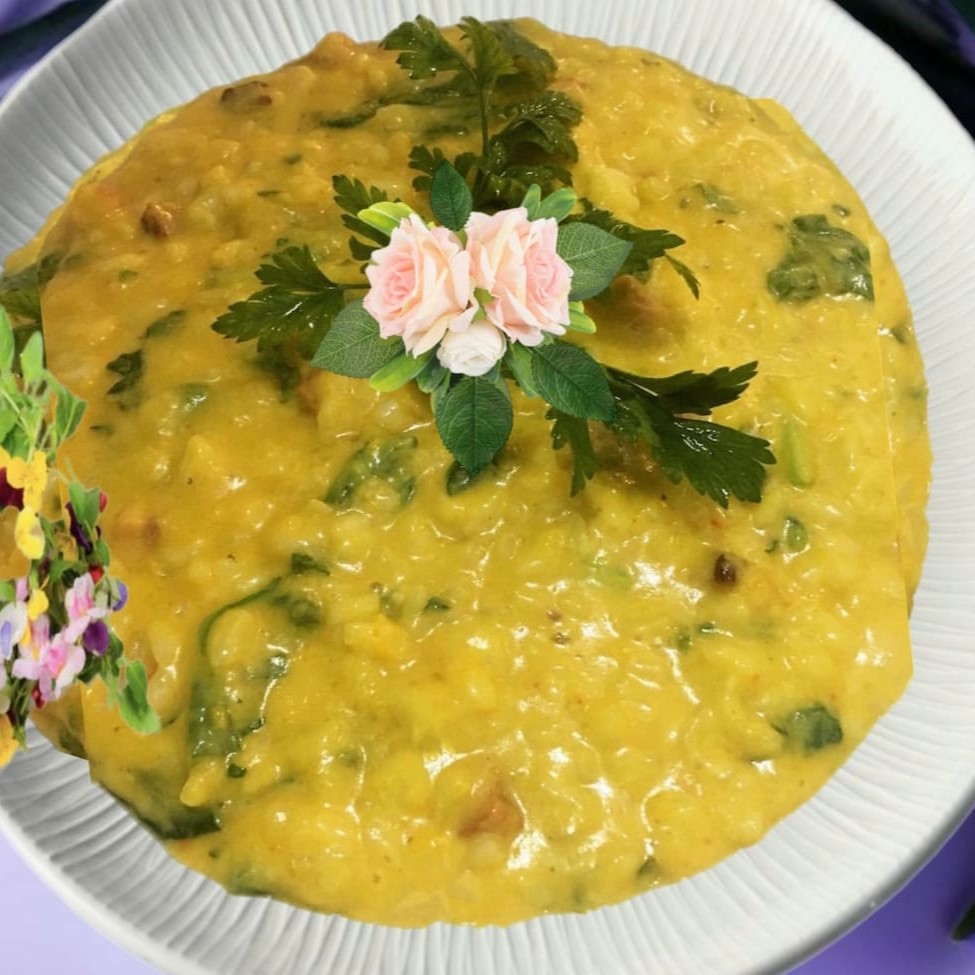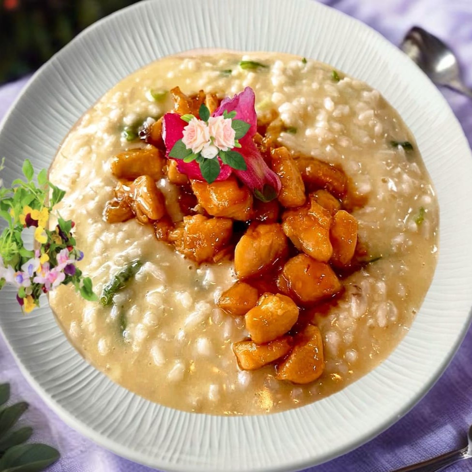 Risoto de alho poro, é finalizado com queijo parmesão e a suavidade da manteiga. Adicionamos ainda suculentas iscas de frango (100g) grelhadas e salteadas em calda citrica de tangerina e gengibre, oferecendo um contraste agridoce e vibrante. Proporciona uma experiência gastronômica única e inesquecível para apreciadores da culinária Italiana com toques adocicados.