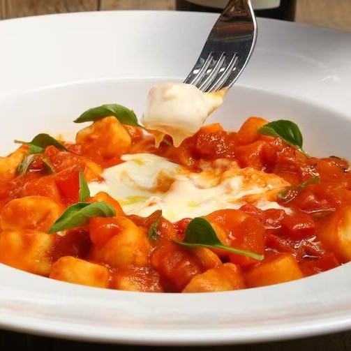 Gnocchi de batata servido ao Pomodoro Basilico com tomates frescos, bacon e manjericão. Coberto com uma Fonduta leve de queijo gorgonzola.