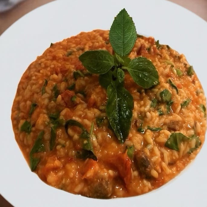 O Risoto Caprese é uma iguaria italiana, preparada com arroz arbório, ao molho pomodoro basilico com folhas frescas de manjericão e iscas de Filet Mignon. O vinho branco acrescenta uma elegante nota de sabor, e a finalização com queijo parmesão, manteiga, tomate seco e rúcula dá um toque de sofisticação ao prato.