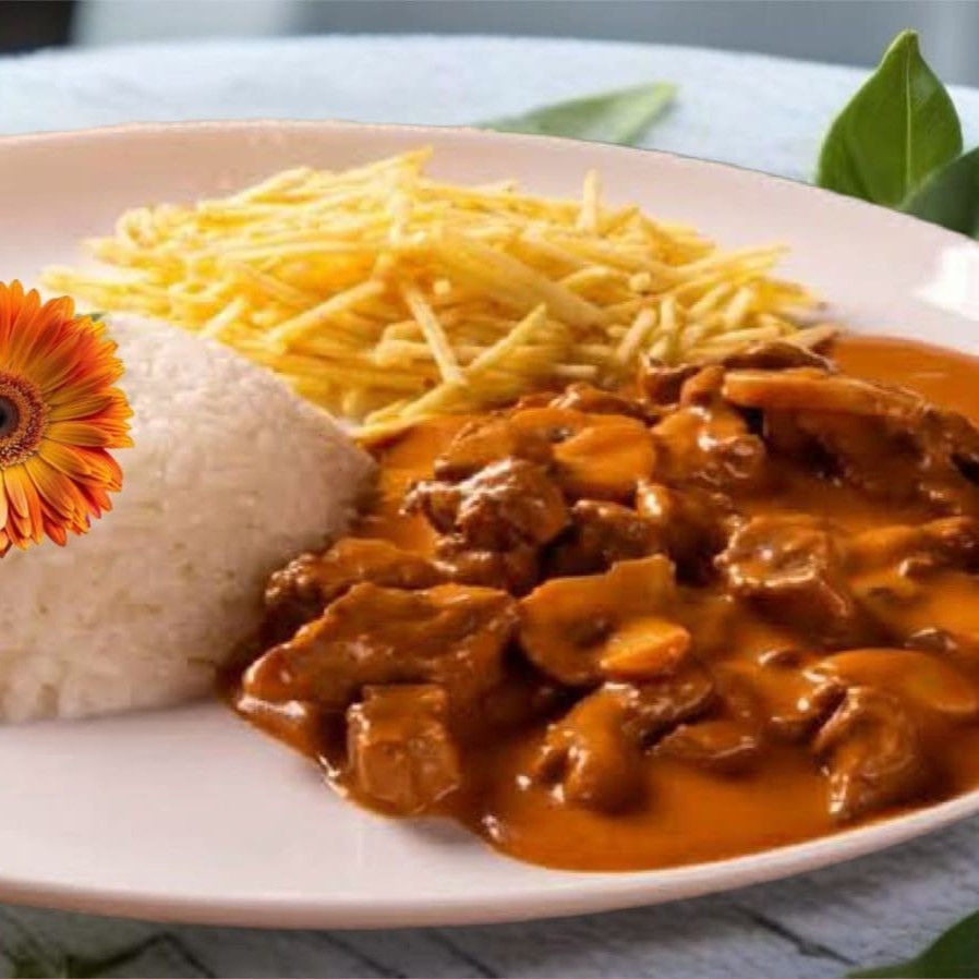 Clássicos 'Strogonoff de Filet Mignon ou de Frango', envoltos em creme de leite. Ketchup, champignons e mostarda cítrica. Acompanha um arroz branco e batatas palha crocantes.