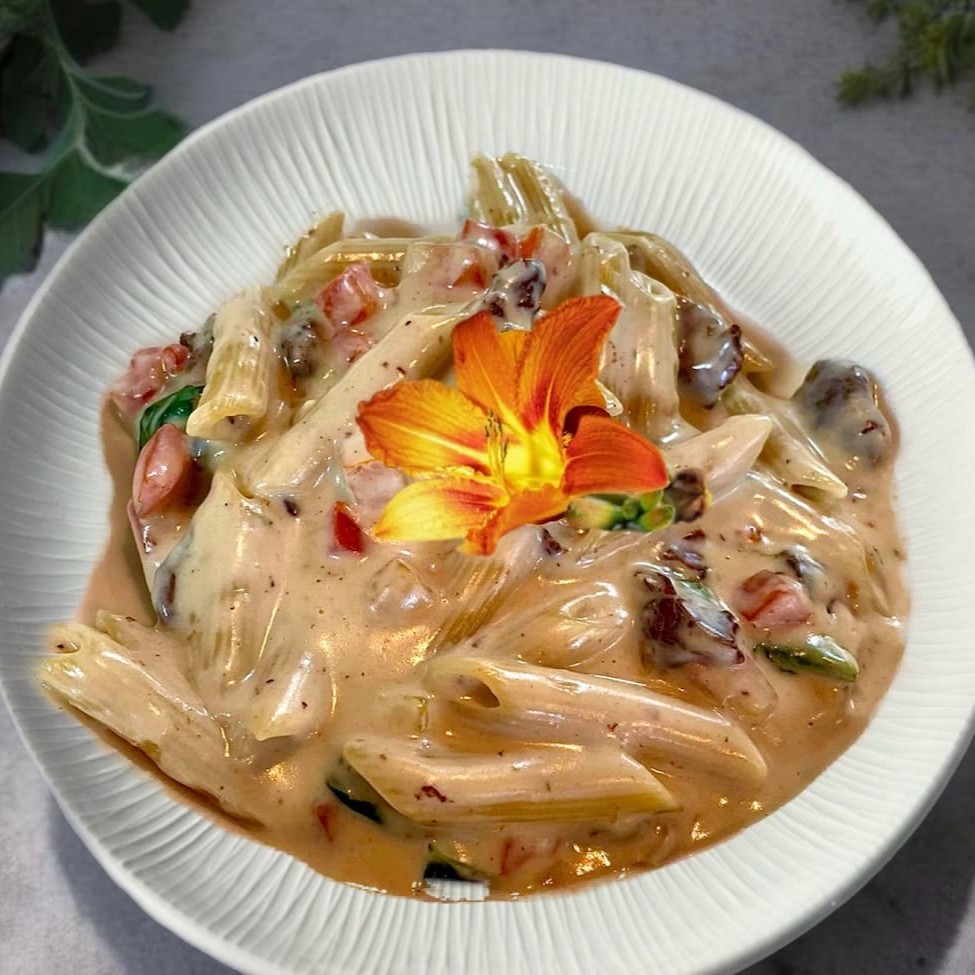 Este prato é preparado com Penne, servido com iscas de mignon envoltas em um cremoso molho Bechamel (Molho Branco) com um leve toque de queijo gorgonzola. Finalizado com tomates frescos e manjericão que adicionam uma nota de frescor. Um prato potente e cheio de sabores.