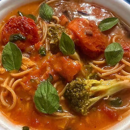 Esta combinação é um prato rústico e vibrante, que equilibra a acidez do molho pomodoro com a intensidade dos tomates secos, o amargor suave do brócolis, a untuosidade das azeitonas, e o frescor aromático do manjericão e do gengibre.
