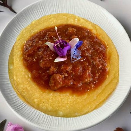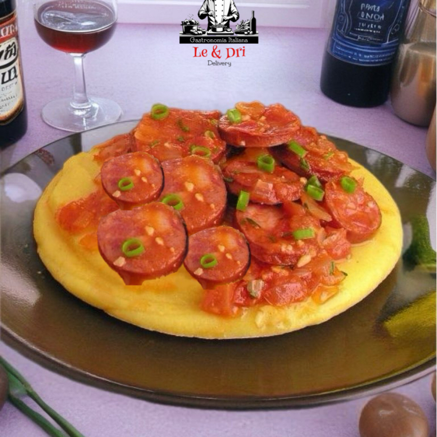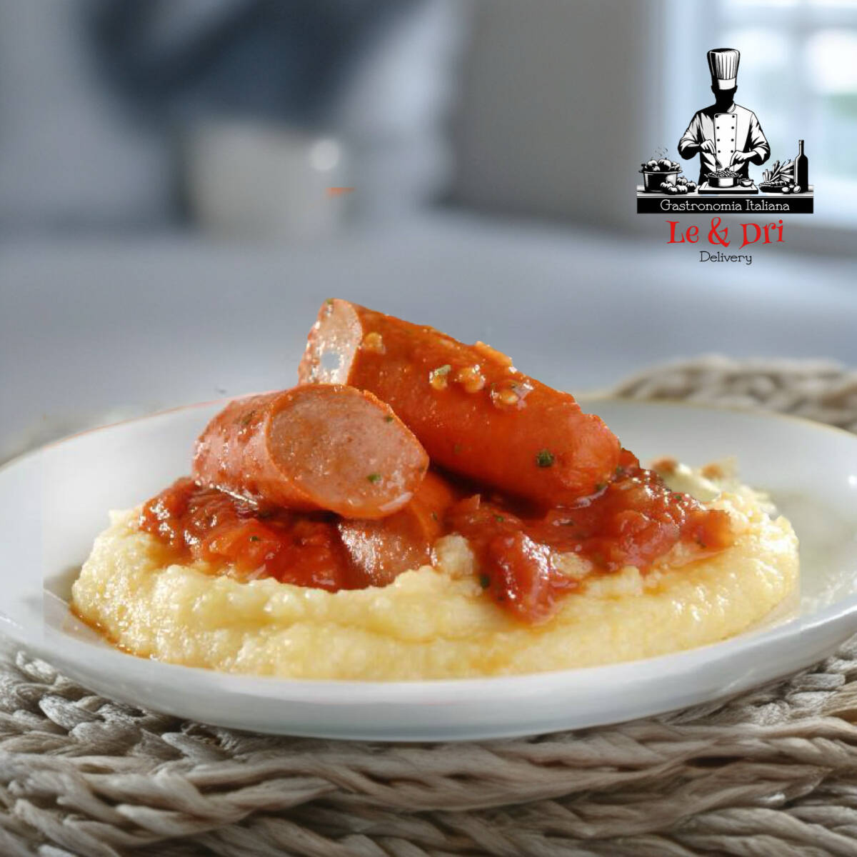 Deliciosa Polenta cremosa, coberta com generosas fatias de Salsicha de qualidade, servidas ao molho Pomooro Basilico, tomates frescos e manjericão.