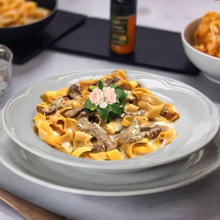 Este prato apresenta um saboroso Fetuccine, servido com molho Bechamel (branco) de textura cremosa com cubos de Filet mignon e folhas frescas de manjericão. A finalização fica por conta de uma generosa porção de queijo Parmesão que derrete sobre o molho, criando uma camada extra de sabor e requinte.
