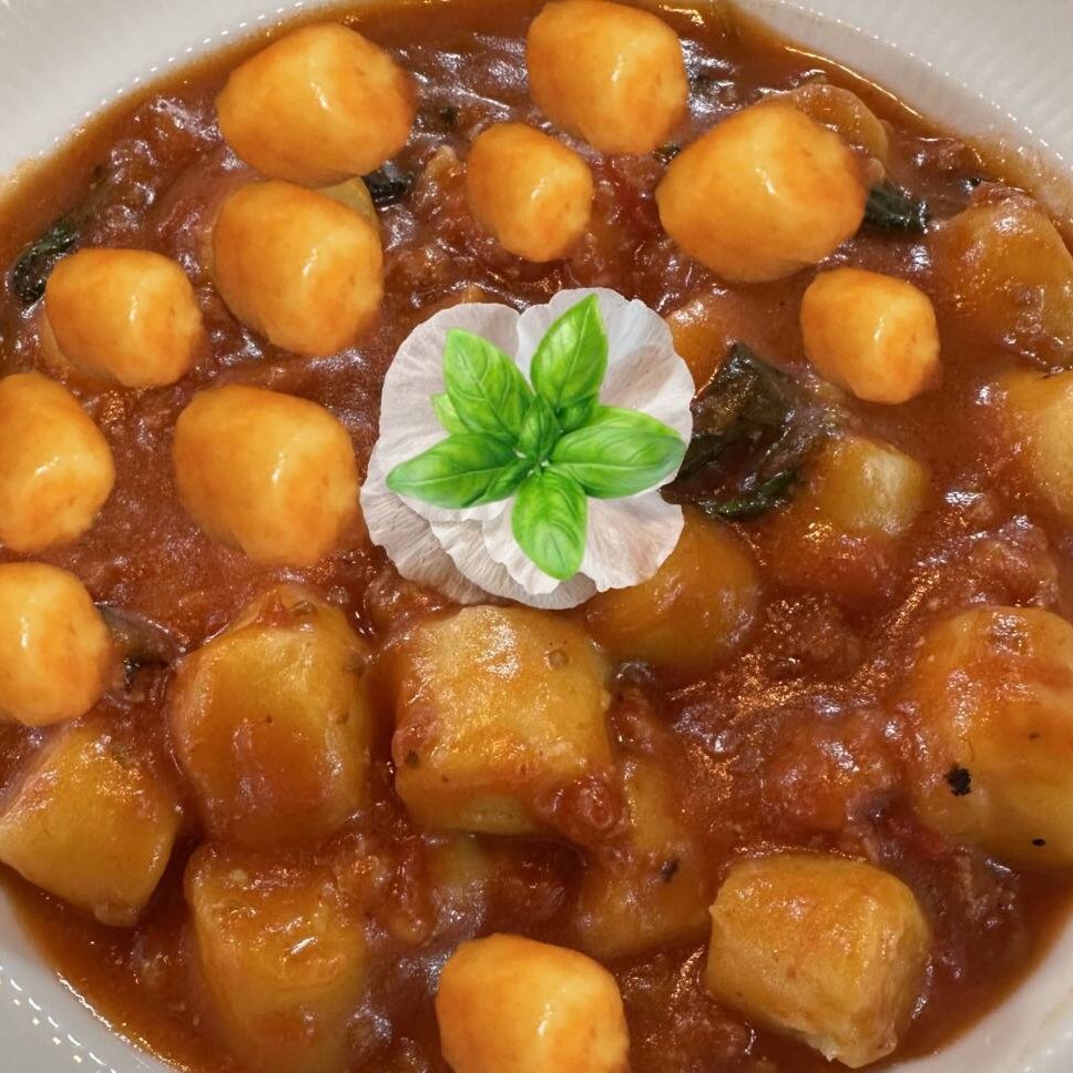 Gnocchi de batata (Nhoque) - servido ao molho Bolonhesa. O molho Bolonhesa é preparado com carne moida com temperos do Chef. Ao molho Pomodoro basilico. Acrescentamos, com elegância, tomates frescos concasse e manjericão, conferindo um sabor autêntico e fresco.