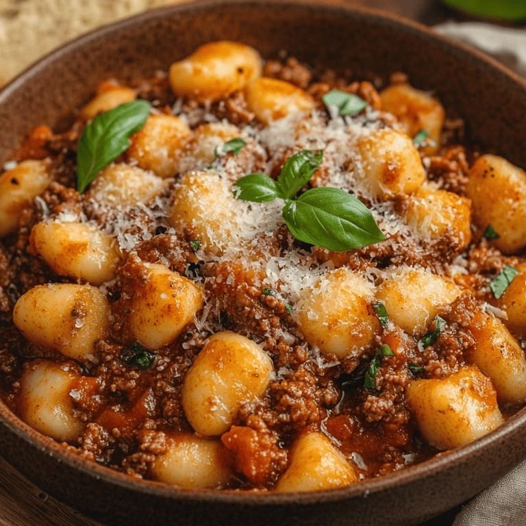Gnocchi de batata servido ao molho Bolonhesa. O molho Bolonhesa é preparado com carne moida com temperos do Chef. Ao molho Pomodoro basilico. Acrescentamos, com elegância, tomates frescos concasse e manjericão, conferindo um sabor autêntico e fresco.