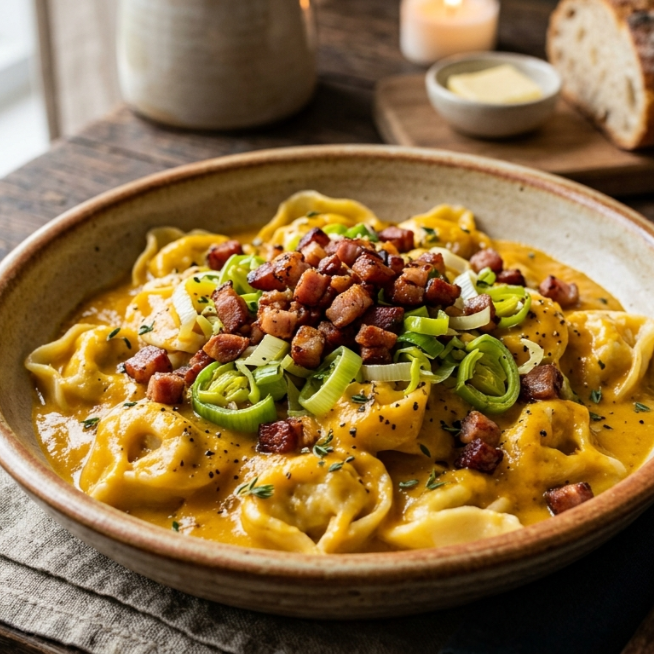 Um prato reconfortante, preparado como uma "sopa cremosa" ou um "capeletti ao molho veludado". A combinação da abóbora (Cabotiá) com o salgado do bacon e o sabor suave do alho-poró cria um equilíbrio perfeito.