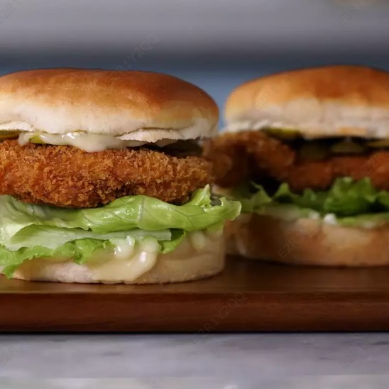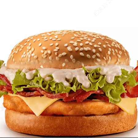 Pão com gergelim, Hambúrguer de frango empanado (feito 100% de peito de frango), Queijo, Bacon, Alface e Maionese Defumada.